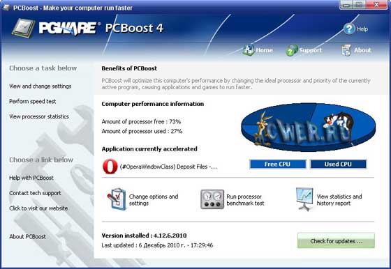PCBoost - это приложение, которое позволяет оптимизировать производительность вашего компьютера и заставить ее работать быстрее! PCBoost это программа, которая позволяет запускать программы гораздо быстрее. PCBoost практически без усилий, легко оптимизирует программы и игры, что заставляет их работать быстрее поэтому отпадает необходимость покупки нового компьютера. Многие программы и игры часто используют минимальное количество мощности ЦП что часто приводит к простою процессора. PCBoost пользуется этим, выделяя больше ресурсов процессора для активных в данный момент программ и игр. Все это делается автоматически без вас.
