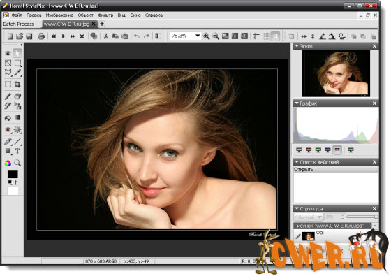 Hornil StylePix - программа, позволяющая ретушировать фотографии, изменять их размер, повернуть, провести цветокоррекцию, наложить текст, сделать фотоколлаж, вырезать, копировать и вставлять фотографии, применять различные фильтры, удалять эффект красных глаз и многое, многое другое. Имеет интуитивно понятный пользовательский интерфейс. Он предназначен для легкого и удобного управления отдельными функциями.