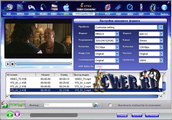 Невероятно простой в использовании, Extra Video Converter Pro это мощный инструмент, позволяющий разделять видео файлы на части и конвертировать между популярными форматами: AVI, WMV, MPEG, MPG, MP4, MOV, DV, H.264, 3GP и т.д. Эти форматы поддерживаются устройствами и плеерами, такими как iPod, Zune, iPhone, Apple TV, PSP, Creative Zen, КПК, мобильными телефонами, Xbox 360 и другими.