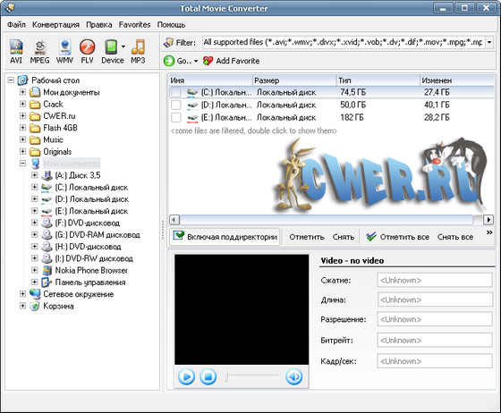 Total Movie Converter - удобное решение для преобразования видео файлов. Поддерживаются наиболее популярные видео форматы AVI, MPG, WMV, MPEG, VOB, IVF, DIVX, MPE, M1V, M2V, mpeg4, ASF MOV, FLI, FLC в AVI, MPG, WMV, MPEG всего лишь несколькими кликами. Режим одновременного преобразования множества файлов сэкономит Ваше время. Просто выберите исходные файлы для конвертирования и конечный формат - со всем остальным программа замечательно справится без Вашего участия!