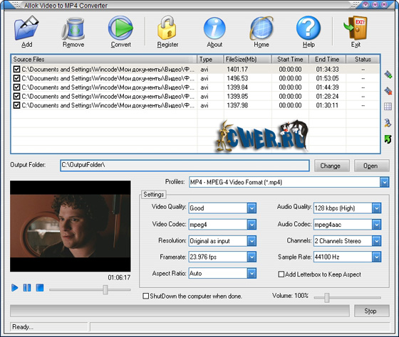 Allok Video to MP4 Converter - конвертер видео файлов различных форматов в MP4 формат. Поддержка: DivX, XviD, AVI, WMV, MPG, MPEG, MP4, M4V, FLV, 3GP, ASF, RM, RMVB, MOV, ASX, MKV, OGM, SVCD, VCD, VOB и других видео форматов, пакетный режим конвертирования, выбор и настройка качества конвертирования по аудио и видео потокам отдельно, предварительный просмотр результата, высокая скорость и высокое качество, приятный и простой интерфейс.