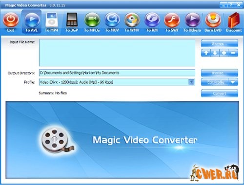 Magic Video Converter - многофункциональный конвертер со встроенным редактором и рекордером, который поможет вам преобразовать нужный файл в определенный формат: AVI, MPEG, MPEG 1, MPEG 2, MPEG 4, VCD, DVD, SVCD, RMVB, RM, WMV и другие видео форматы. Помимо этого программа позволяет: захватывать видео с DV и Аnalog камер, VCR, TV тюнеров и WEB камер; использовать пакетный режим конвертирования; извлекать аудио дорожки из видео, раскладывать видео на последовательность графических файлов; выбрать и настроить оптимальные кодеки сжатия ваших файлов. Программа поддерживает большинство пишущих CD/DVD приводов, имеет простой и удобный интерфейс, высокую скорость конвертации и высокое качество получаемого результата.