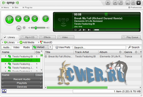 Spider Player - аудио проигрыватель и одновременно конвертер музыки. Программа воспроизводит многочисленные аудио-форматы файлов, включая MP3, AAC, AC3, Ogg Vorbis, FLAC, WAV, CDDA, WMA, MID, KAR и другие, конвертируя их между собой. Spider Player также умеет распаковывать треки из Audio CD и сохранять их в такие форматы, как MP3, WMA, OGG и WAV. В программе имеется функция редактирования ID3 тегов MP3 файлов и метаданных OGG и WMA, поиска композиций в плейлисте и добавления текстов песен в музыкальные файлы. Прослушивая мелодии можно включить визуализацию, добавлять эффекты к композициям и изменять частотный баланс, благодаря эквалайзеру в 10 полос. Ну и в заключении, плеер поддерживает потоковые интернет-радиостанции и сменные визуальные темы.