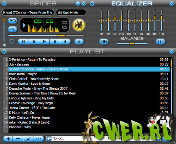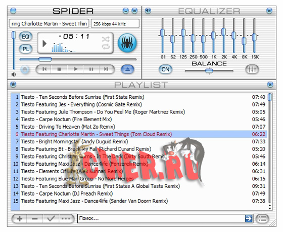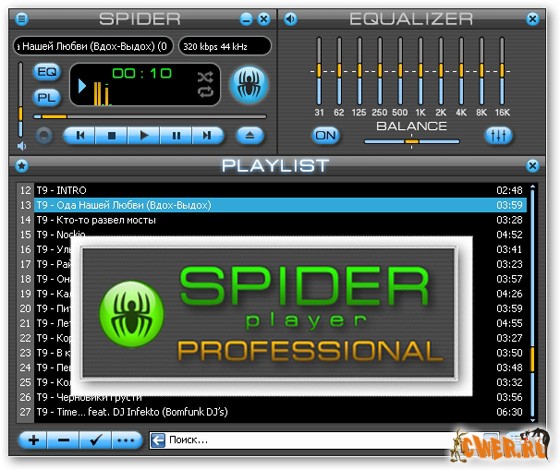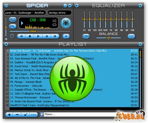 Spider Player - аудио проигрыватель и одновременно конвертер музыки. Программа воспроизводит многочисленные аудио-форматы файлов, включая MP3, AAC, AC3, Ogg Vorbis, FLAC, WAV, CDDA, WMA, MID, KAR и другие, конвертируя их между собой. Spider Player также умеет распаковывать треки из Audio CD и сохранять их в такие форматы, как MP3, WMA, OGG и WAV. В программе имеется функция редактирования ID3 тегов MP3 файлов и метаданных OGG и WMA, поиска композиций в плейлисте и добавления текстов песен в музыкальные файлы. Прослушивая мелодии можно включить визуализацию, добавлять эффекты к композициям и изменять частотный баланс, благодаря эквалайзеру в 10 полос. Ну и в заключении, плеер поддерживает потоковые интернет-радиостанции и сменные визуальные темы.