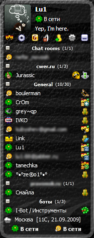 После его установки можно будет обмениваться сообщениями сразу во всех перечисленных сетях без установки самих программ ICQ, AIM и т.д. Доступны такие возможности, как зашифрованный чат (как двухсторонний, так и в режиме конференции), поддержка множественных ICQ/AIM одновременных сессий, мультисерверные соединения, звуковые эффекты, поддержка скинов (через XLM) c возможностью подстройки (вроде прозрачного фона).