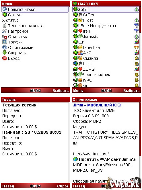Jimm - ICQ-пейджер для мобильников с огромным количеством возможностей и настроек, с анимированными смайлами и возможностью создавать новый аккаунт.