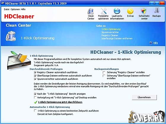 HDCleaner - утилита, при помощи которой вы можете быстро очистить свой жесткий диск от ненужных файлов с расширениями BAK, CHK, GID, ~ * *, TMP. Кроме того, можно настроить программу и расширись список удаляемых файлов.