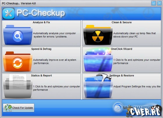 PC-Checkup 4.0 служит для анализа компьютера на наличие ошибок, в результате которых замедляется его работа и проявляется нестабильность. PC-Checkup предельна проста. Всего один клик мышью и в течении нескольких минут все ошибки на компьютере будут найдены и исправлены.