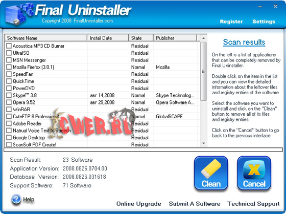Final Uninstaller - программа очистки жестких дисков и системного реестра от мусора, оставшегося после удаления каких-либо программ. Программа использует высокоэффективный алгоритм обнаружения, который позволяет быстро просканировать систему и найти ненужные файлы. За несколько щелчков мыши программа просканирует ваш жесткий диск и реестр Windows, после чего предоставит вам список приложений, которые были неправильно деинсталлированы. После чего вы сможете выбрать приложения для последующего их полного удаления с компьютера. Программа имеет понятный пользовательский интерфейс и проста в использовании.