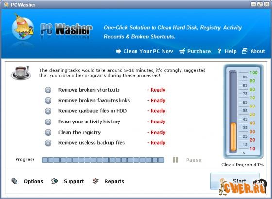 PC Washer - программа, которая просканирует вашу систему и выдаст в процентном отношении её захламленность для принятия пользователем решения. Программе известно более 80 видов ненужных файлов, которые он готов удалить переместив их в корзину. PC Washer заставит вашу систему стать более устойчивой и работать быстрее, автоматически очищая ее от: временных интернет файлов и файлов оставленных программами; ненужных логов и файлов резервного копирования; пустых (нулевых) файлов; index.dat файлов; битых ярлыков; недействительных записей реестра и т.д.