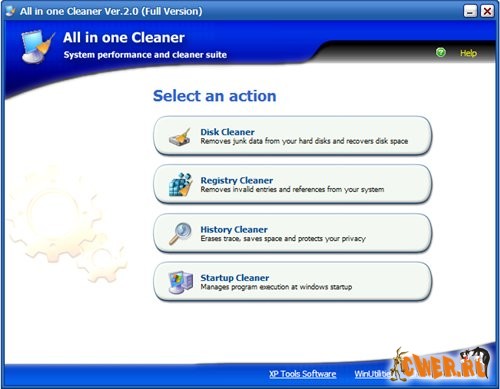 Набор инструментов для очистки системы от различного мусора. All in one Cleaner включает в себя Disk Cleaner (очистка диска), Registry Cleaner (очистка реестра), History Cleaner (очистка истории) и Startup Cleaner (очистка автозапуска). Позволяет удалять ненужные файлы и следы пребывания в Интернете, находить и удалять неверные записи в реестре, очищать историю Интернета, управлять файлами cookies и многое другое. В дополнение к этому All in one Cleaner имеет опции исправления ошибок реестра и оптимизации работы всей системы.