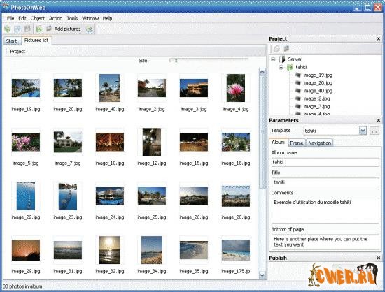 PhotoOnWeb - это приложение которое позволяет создавать фотоальбомы на различные темы, размещать их в Интернете для общего доступа. Фотографии в программе можно распределить по нескольким альбомам (например, свадьба, поездка и т.д.), выбрать для них соответствующие шаблоны, а затем кликнуть на кнопку Publish (опубликовать), чтобы создать альбом. PhotoOnWeb автоматически изменит размеры снимков до оптимального, создаст веб-сайт и опубликует в сети фотоальбом. Эти фотоальбомы можно публиковать как на любом своем сайте, так и на сервере разработчика данной программы, создав там аккаунт. Навигация создается с помощью технологии Flash, что позволяет удобно просматривать снимки, перемещаясь между ними с помощью мыши или клавиатуры.