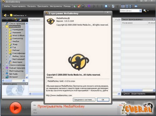 MediaMonkey Gold - Программа, предназначенная для ведения базы данных музыкальных файлов. Данная утилита позволяет собрать все музыкальные композиции в единый каталог. MediaMonkey работает с распространенными форматами музыкальных файлов: MP3, OGG, WMA, MPC, FLAC, APE. Она обладает широкими возможностями, среди которых можно выделить следующие: поддержка скинов, встроенный CD-ripper, CD-burner и конвертер аудио форматов. Также следует отметить такую возможность программы, как выравнивание громкости композиций. Эта функция очень полезна, например, при записи музыкальных дисков формата CDA, когда треки играют с разной громкостью. В последних версиях улучшена работа с плеером iPod, улучшена синхронизация баз данных, улучшена работа с музыкальными тегами в кодировке unicode, исправлено множество багов и ошибок.