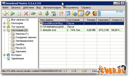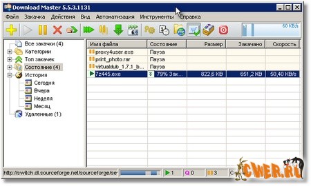 Программа Download Master является очень хорошей качалкой файлов из Интернета. Основными чертами, выделяющими Download Master среди других программ, являются высочайшая эффективность работы и удобный пользовательский интерфейс. Программа позволяет значительно повысить скорость закачки файлов через Интернет с использованием HTTP, HTTPS и FTP протоколов, для этого используется разбиение файла на потоки, которые закачиваются одновременно.