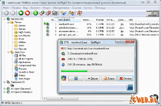GetRight - менеджер закачек. Программа поддерживает докачку, разбиение файлов для многопоточной загрузки, поиск зеркал и файлов, работу с прокси-серверами и мониторинг кликов в буфере обмена и браузерах Internet Explorer, Netscape Communicator, Opera, NetCaptor и NeoPlanet. Интегрируется в Windows shell и может работать совместно с антивирусным ПО. Есть встроенный браузер для просмотра FTP-сайтов, утилита для дозвона и планировщик задач для работы по расписанию. Программа имеет удобный интерфейс и легко конфигурируется.