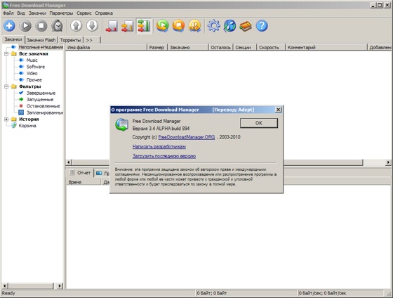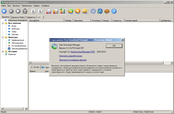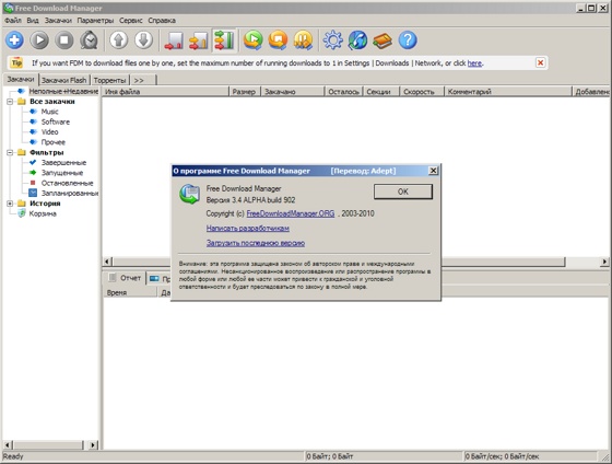 Free Download Manager - альтернативный менеджер закачек. Содержит встроенный планировщик, докачивает файлы, для ускорения работы разбивает задания на части. Может скачивать файлы в трех режимах загрузки полосы. Доступны и продвинутые настройки для работы с конкретными серверами (имя, пароль, число подключений, группа и прочее).