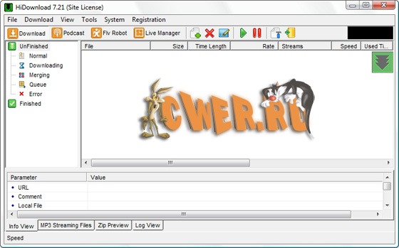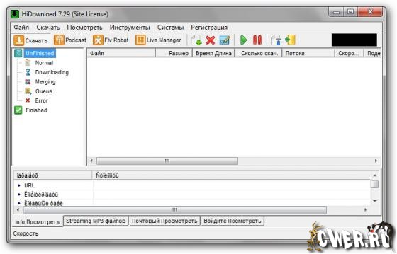 HiDownload - менеджер загрузок. Поддерживает работу по протоколам HTTP, FTP, RTSP (Windows Media), PNM, MMST и MMSU (это значит, что потоковое аудио - RA, RM и Apple Quicktime Streaming - можно "скачать" без проблем). Может работать через прокси, позволяет просматривать архивы и скачивать из них только необходимые файлы, позволяет сохранять Flash, имеется встроенный поиск MP3-файлов.