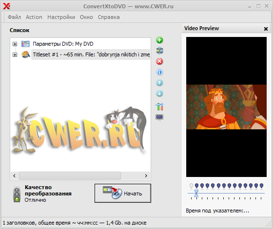 ConvertXtoDVD - программа предназначена для преобразования видео в формат, совместимый с DVD Video, и последующей записи содержимого на DVD. Программа поддерживает видеофайлы Mpeg, Mpeg4, MP4, VOB, WMV, DV, AVI, а также потоковое видео. Для работы программы не нужны внешние AVI-кодеки, поскольку она использует собственные. ConvertXtoDVD может автоматически создавать фрагменты (chapters), поддерживает наличие нескольких аудиодорожек, работает с субтитрами (.SRT .SUB/IDX .SSA). Также программа поддерживает создание несложного меню для DVD, в котором можно установить фон, выбрать цвет и другие параметры шрифта для надписей.