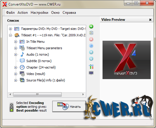 ConvertXtoDVD - программа предназначена для преобразования видео в формат, совместимый с DVD Video, и последующей записи содержимого на DVD. Программа поддерживает видеофайлы Mpeg, Mpeg, Mpeg4, MP4, VOB, WMV, DV, AVI, а также потоковое видео. Для работы программы не нужны внешние AVI-кодеки, поскольку она использует собственные. ConvertXtoDVD может автоматически создавать фрагменты (chapters), поддерживает наличие нескольких аудиодорожек, работает с субтитрами (.SRT .SUB/IDX .SSA). Также программа поддерживает создание несложного меню для DVD, в котором можно установить фон, выбрать цвет и другие параметры шрифта для надписей.