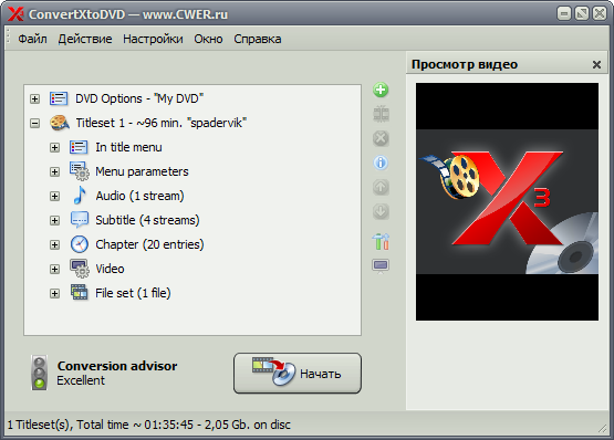 ConvertXtoDVD - программа предназначена для преобразования видео в формат, совместимый с DVD Video, и последующей записи содержимого на DVD. Программа поддерживает видеофайлы Mpeg, Mpeg, Mpeg4, MP4, VOB, WMV, DV, AVI, а также потоковое видео. Для работы программы не нужны внешние AVI-кодеки, поскольку она использует собственные. ConvertXtoDVD может автоматически создавать фрагменты (chapters), поддерживает наличие нескольких аудиодорожек, работает с субтитрами (.SRT .SUB/IDX .SSA). Также программа поддерживает создание несложного меню для DVD, в котором можно установить фон, выбрать цвет и другие параметры шрифта для надписей. Программа имеет русский интерфейс.