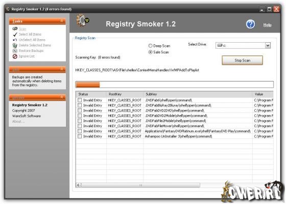 Registry Smoker – это простая в использовании и очень эффективная программа для очищения реестра. Registry Smoker точно определяет ключи, которые недействительны или не используется, используя метод по трем действиям для проверки каждого ключа, чтобы точно определить его действительность. Registry Smoker также позволяет вам создавать список игнорирования для игнорирования всего, что может быть определено, как недействительное, но вы определяете, что эти ключи действительны. Таким методом данная программа может игнорировать эти ключи при всех последующих сканированиях.