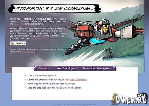 Mozilla Firefox 3.1 Beta 3 - новейшая версия популярного браузера Firefox во много раз лучше встроенного в Windows браузера Internet Explorer во многих отношениях. Во-первых, он позволяет открывать несколько страниц в одном окне, экономя тем самым свободное место на панели задач. Во-вторых, браузер имеет гибкую систему управления загрузкой графики. В отличие от Internet Explorer, Firefox позволяет отключать отображение графики на выбранных страницах, а не на всех сразу.