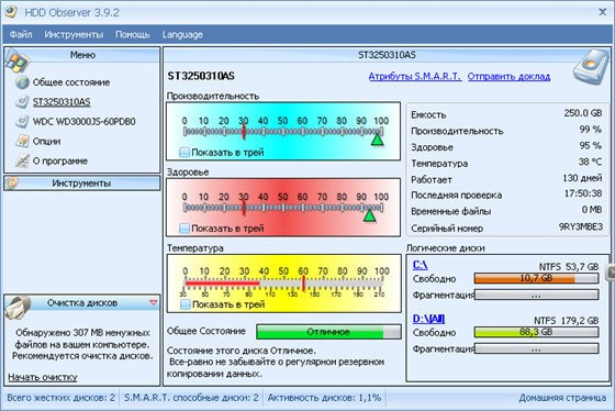 HDD Observer - программа для мониторинга состояния и восстановления работоспособности жестких дисков. Программа следит за состоянием жестких дисков, контролирует производительность и температуру, а также проверяет фрагментацию файловой системы и реестра. При этом проверка фрагментации происходит только в тот момент, когда компьютер не используется, и все системные ресурсы являются свободными. Помимо этого, программа может производить дефрагментацию и автоматически в режиме реального времени находить и удалять ненужные файлы и записи в реестре.