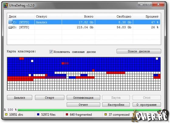 UltimateDefrag - это дефрагментатор и оптимизатор размещения файлов на жестком диске, который учитывает больше чем только фрагментацию файлов. Фрагментация файла - только незначительная часть улучшения работоспособности накопителя, другая, более важная часть - относительное размещение наиболее часто используемых файлов на вашем винчестере, а также уплотнение файлов. UltimateDefrag имеет очень высокую скорость работы и позволяет достигнуть максимальных результатов.