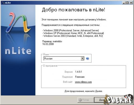 nLite - программа для создания своего собственного инсталляционного диска Windows 2000, Windows XP, Windows Server 2003. С её помощью Вы можете создавать диски с уже интегрированными сервис паками, а также с необходимым набором утилит, драйверов, кодеков, антивирусными обновлениями, и многим другим...