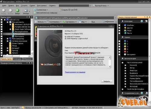 ACDSee Pro - профессиональная версия программы для работы с цифровыми фотографиями, которая обладает расширенным набором функций, рассчитанных на профессиональных фотографов. Поддерживает более 100 форматов графических файлов, позволяет работать с RAW-изображениями, автоматически сортировать фотографии по параметрам, полученным из цифровых фотокамер, содержит эффективный визуальный метод добавления к изображениям метатегов и быструю пакетную обработку большого количества картинок, в том числе и в RAW формате. Кроме того, здесь присутствуют инструменты для независимого регулирования цветовых каналов, исправления артефактов фотографий, появляющихся из-за погрешностей оптики, добавления "водяных знаков", работы с IPTC-метаданными, имеется возможность архивирования графических коллекций в ZIP-файлы, запись на CD или DVD и многое другое.