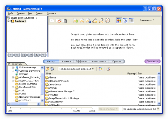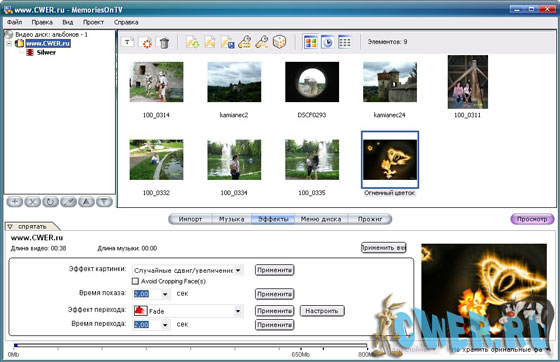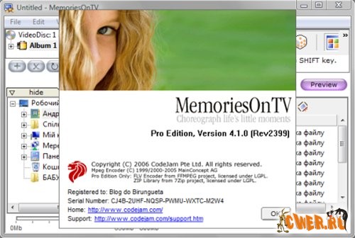 Обновленная версия MemoriesOnTV Pro Clipshow 1.1 Ваши фотографии (формат любой кроме PSD) и/или видеоклипы (mpg, avi, mov, mp4) - это всё, что нужно для создания/записи собственного качественного DVD, VCD или sVCD с потрясающими голливудскими переходными эффектами, музыкальным сопровождением и возможностью просмотра на стандартных DVD, VCD плеерах или на компьютере.