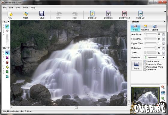 Life Photo Maker позволяет добавлять визуальные и звуковые эффекты к вашим фотографиям. Вы можете легко добавить водяные эффекты, такие как водопад, берег или озеро наложив водяную маску на ваши фото. Вы также можете добавить эффекты снега и дождя, а также до 8 каналов звуковых эффектов. Полученный результат можно сохранить в виде скринсейвера, видео (.avi), или анимированного изображения (.gif).