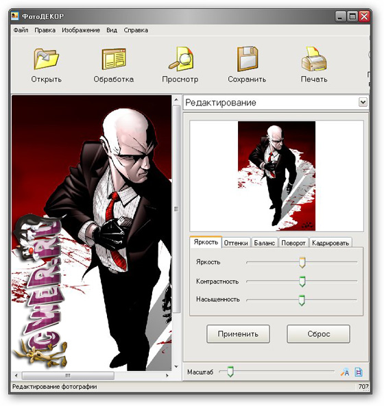 ФотоДЕКОР - это новая программа для оформления фотографий и создания эффектов. Буквально за пару секунд Вы сможете наложить стильную рамку, создать поздравительную открытку или коллаж. Программа включает все необходимые функции для обработки цифровых фотографий: автоматическое улучшение и редактирование, создание спецэффектов, обрамление, добавление украшений и надписей. Комплект программы включает около трёхсот различных вариантов оформления, а в полной версии их число увеличивается до тысячи!