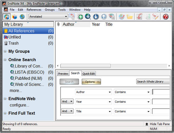 EndNote - самая популярная программа для поиска в on-line библиографических ссылок и данных в различных базах данных библиотек и научных заведений мира, EndNote отличный инструмент в руках научного работника, инженера, изобретателя, библиографа, студента и просто увлеченного человека. Данная программа просто незаменима при написании научных работ и диссертаций а также при поиске библиографических данных книг, научных журналов и статей, EndNote позволяет вести поиск по самому широкому спектру представленных Вами данных. Имея данную программу и подключение к Интернету Вам больше не надо выискивать часами и днями названия книг или точные библиографические данные научной статьи в пыльных и каталогах библиотек.