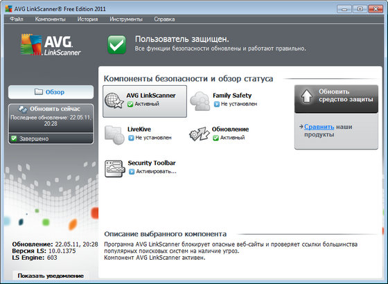 AVG LinkScanner - бесплатная программа, которая в режиме реального времени проверяет веб-страницы, посещаемые пользователем, на наличие вредоносного кода и других Интернет-угроз. Программа обеспечивает комплексную защиту при поиске и просмотре страниц в Интернете. Данная защита включает в себя два компонента: Active Surf-Shield и Search-Shield. Компонент Active Surf-Shield защитит систему от вредоносного содержимого и интернет-атак при посещении веб-сайтов, не позволяя вам стать жертвой вредоносной активности. Search-Shield отображает рейтинг безопасности для всех результатов поиска, возвращаемых самыми популярными поисковыми службами. Таким образом вы можете определить, насколько безопасна страница до ее посещения.
