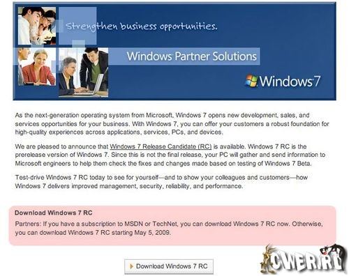 На сайте Microsoft Partner Program ненадолго появилось сообщение, что новая версия операционной системы Windows 7 RC (Release Candidate) уже доступна для загрузки через MSDN или TechNet участникам этой программы. Остальные пользователи смогут загрузить Windows 7 RC, начиная с 5 мая. Правда, затем упоминание о Windows 7 RC было убрано с сайта Microsoft Partner Program, оно было заменено на старую информацию о бета-версии Windows 7. Но скриншоты страницы уже разлетелись по мировой сети.