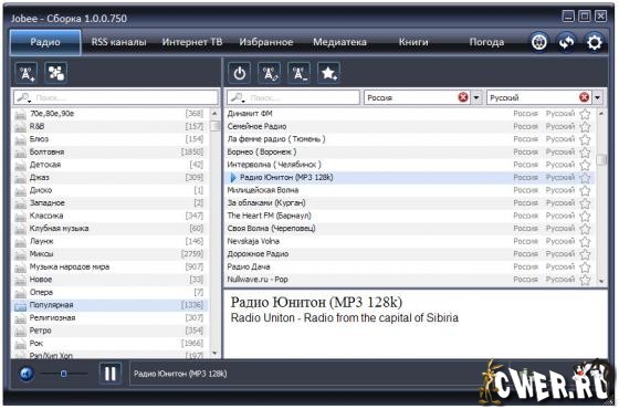 Jobee – это удобный плеер, предназначенный для комфортного прослушивания интернет радиостанций и аудио-подкастов, просмотра интернет-телевидения, чтения RSS-лент. Программа запомнит до какого момента вы прослушали аудио-подкаст или какую последнюю радиостанцию вы слушали. Он сам скачает Вам обновления в RSS-лентах и сообщит об этом нотификатором в правом нижнем углу экрана.