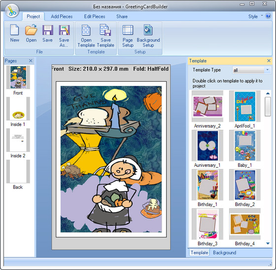 Greeting Card Builder - простая в использовании программа для создания великолепных поздравительных открыток для Дней рождения, Юбилеев, Дня благодарения, Рождества, Пасхи, Нового года, Дня Святого Валентина и других праздников.