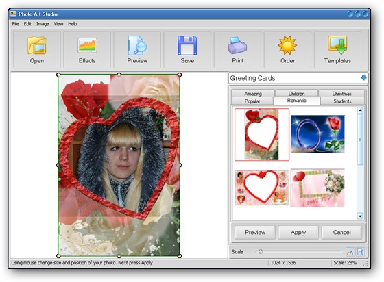 Greeting Card Studio - легкая в использовании программа для быстрого создания высококачественных поздравительных открыток. С помощью этой программы вы сможете создавать открытки, используя ваши собственные изображения, фон и текст. Программа содержит в себе готовые профессиональные шаблоны, предназначенные для быстрого создания открытки. Вам нужно всего-лишь выбрать бумагу, нужный дизайн, открыть понравившийся шаблон, отредактировать открытку и распечать ее на принтере. Также вы сможете создать собственный уникальный дизайн и наложить на картинки эффекты, рамки, границы, сделать фон и наложить различные изображения на вашу открытку. При этом, вам дается возможность масштабирования и переворачивания фотографий как вы пожелаете. Готовый результат вы сможете распечать на принтере или сохранить в один из графических форматов.
