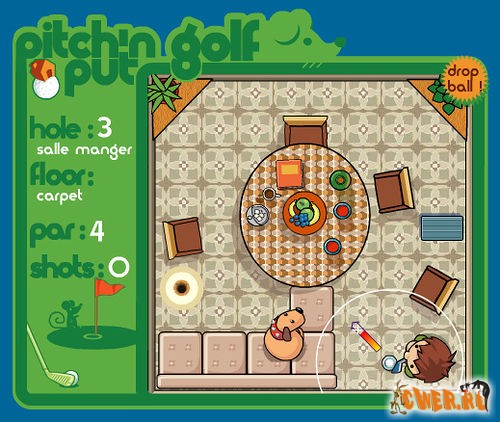 Гольф в домашних условиях. То ли кот будет препятствовать попадания в цель, то ли собачка. Интересная флеш-игра.