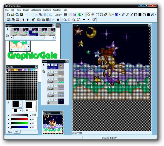 GraphicsGale - небольшой редактор растровых изображений с хорошим набором инструментов для рисования мелкой по размеру графики, например, иконки. С помощью данной программы вы сможете ретушировать фотографии, рисовать картинки и многое другое. В отличие от множества графических редакторов, данная программа позволяет создавать анимированные изображения с предпросмотром результата в отдельном окне. Программа отлично подойдет для рисования и редактирования иконок в форматах ICO, курсоров, анимированных GIF изображений и многого другого. Также данная программа имеет поддержку открытия AVI файлов (без звука). Как и большинство графических редакторов, программа работает со слоями, имеет собственный модуль для просмотра изображений, а также позволяет обрабатывать изображения в пакетном режиме. Интерфейс программы очень прост и легок в использовании.