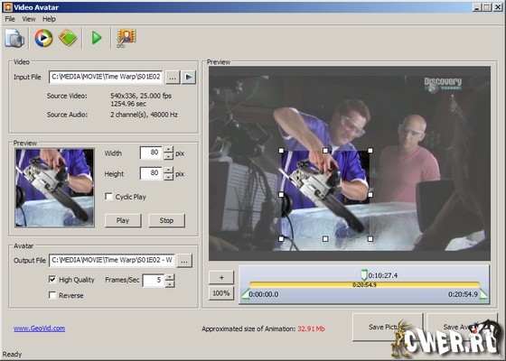 Video Avatar - великолепный инструмент для создания анимированных GIF аватаров и юзерпиков из любого видео файла.Вы выбираете видео файл, определенную его часть, и производите кадрирование для желаемого аватара или юзерпика.