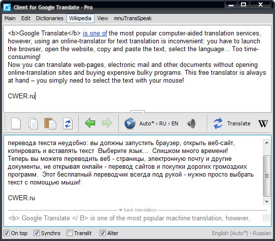 Client for Google Translate - очень удобная и практичная программа, которая моментально переводит выделенный в окне браузера текст с более 50 языков. Client for Google Translate работает также в приложениях Windows таких как Outlook, MS Word и пр. После установки вы увидите иконку Client for Google Translate в системном трее и каждый раз, когда вы хотите перевести некоторый текст, все что вам нужно сделать, это выбрать (выделить) текст и все будет переведено мгновенно. Перевод можно скопировать в буфер обмена. Также можно скопировать текст в буфер обмена и вставить в окно программы, вызываемое щелчком мыши по иконке программы в трее.