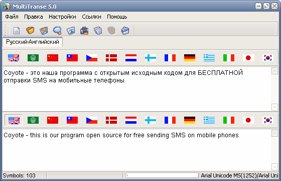 MultiTranse - программа, которая использует бесплатные онлайн ресурсы, для перевода с/на английский, арабский, китайский, голландский, датский, финский, немецкий, испанский, итальянский, русский, польский, норвежский, корейский, чешский, японский. MultiTranse может переводить отдельные слова, небольшие фразы, предложения или тексты, но не более 6000 символов за раз. MultiTranse работает с текстами в формате Unicode и способна при сохранении перекодировать Unicode текст в любую ANSI кодировку и обратно. Если нужный шрифт не обнаружится на компьютере пользователя, программа предложит его загрузить из интернета. Программа имеет русский интерфейс. Для перевода программе требуется интернет-соединение. Программа имеет статус shareware, вы можете пользоваться программой в течение 20 дней после первого запуска.