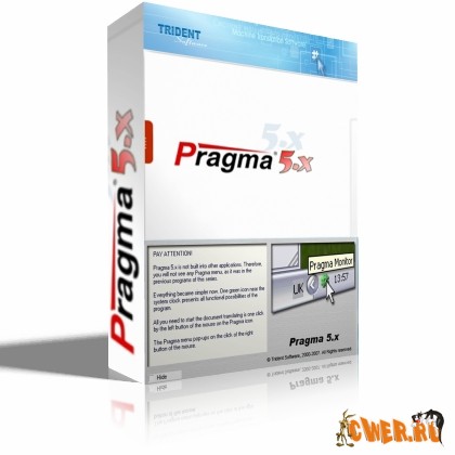 Pragma - система машинного перевода. Pragma поддерживает семь языков: английский, русский, украинский, немецкий, латышский, польский и французский. Перевод возможен между любой парой из этих языков. Число возможных направлений перевода составляет 42. Выполняет перевод непосредственно в окне активного приложения или в отдельном окне быстрого перевода. С помощью программы можно переводить текстовую информацию, представленную в виде документов MS Word, Интернет страниц, почтовых сообщений, справок, а также содержимое различных текстовых окон. За счет автоматизации многих функций Pragma 5.x очень проста в использовании.