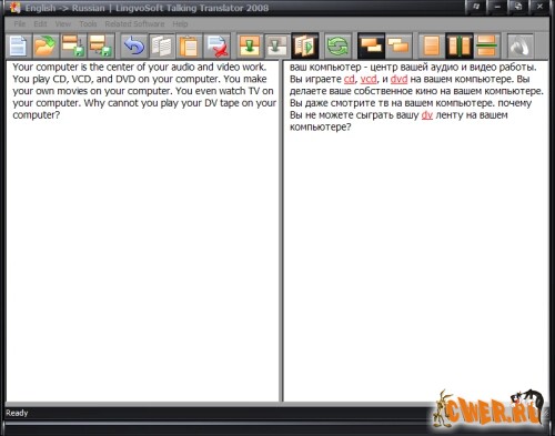 Быстрый перевод любого текста - руководства к компьютерной игре, интерактивной справки, кулинарного рецепта или письма от иностранного друга. Перевод зарубежных Web-сайтов. Oдин щелчок мышью, и сайт на иностранном языке полностью переведен на русский с сохранением форматирования и ссылок. Перевод сообщений в ICQ. Программа мгновенно переведет сообщение в ICQ с иностранного языка на русский и обратно.