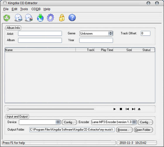 Kingdia CD Extractor является граббером аудио CD и аудио конвертером. Область применения: перенос цифровых аудио треков непосредственно с CD дисков в аудио форматы MP3, WAV, WMA, OGG, VQF и APE и другие форматы. Возможность конвертирования между форматами MP3, WAV, WMA, OGG, VQF , APE. Поддержка переконвертирования с новыми параметрами, поддержка MP2, RIFF-WAV форматов, поиск информации и авто заполнение тэгов по CDDB базе через Интернет, создание и редактирование ID3 тэгов, создание собственной CDDB базы коллекции, встроен проигрыватель аудио файлов, экспорт M3U и PLS плейлистов, простой и удобный интерфейс, высокая скорость и высокое качество.