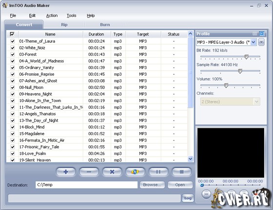 ImTOO CD Ripper - программа для быстрого извлечения трэков с музыкальных CD и конвертации их в форматы MP3, WAV, WMA, OGG Vorbis, VQF или APE. Утилита обладает очень простым интерфейсом, позволяет начать процесс перезаписи одним кликом мыши, поддерживает работу с CDDB. При кодировании можно выбрать необходимый битрейт. Имеется редактор ID3 тэгов, опция нормализации звука и многое другое.