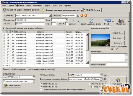 Easy CD-DA Extractor - лучший аудио риппер. Программа копирует аудио треки с аудио-CD на жесткий диск конвертируя в MP3, Windows Media Audio 8, Windows Media Audio 9, Windows Media Audio 9.1, Ogg Vorbis, MP4, M4A, AAC, FLAC, Musepack, VQF, WAV, AIFF и Monkey's Audio. Создает аудио-CD из MP1, MP2, MP3, WMA, Ogg Vorbis, MP4, M4A, AAC, FLAC, Musepack, WAV и Monkey's Audio. В программе встроен плеер с поддержкой ID3 и ID3V2 тегов. Так же можно конвертировать поддерживаемые форматы между собой.