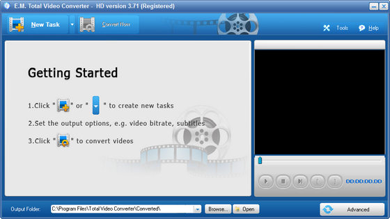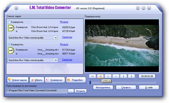 E.M. Total Video Converter HD - это как раз именно тот конвертер, который умеет делать с файлами почти всё. E.M. Total Video Converter это программа не только для конвертирования почти всех видов видео и музыкальных файлов в популярные форматы, включая мобильные, но и CD-риппинг, конструктор фото слайд-шоу с 300-ми различными фантазийными переходными эффектами, сборка и прожиг дисков отвечающих DVD/SVCD/VCD стандартам, извлечение звука из видео файлов с прямой конвертацией в mp3, ac3, ogg, wav, aac, объединение звука и видео в единый файл с синхронизацией, снифер-загрузчик флэш-видео Flv, и многое другое, снабженное собственным высокоскоростным встроенным "движком" и наделенное качественным проигрывателем.
